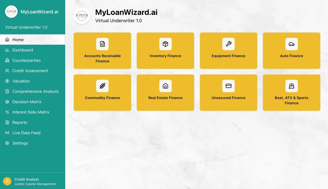 MyLoanWizard.ai is a virtual loan origination and underwriting platform tailored for lenders offering credit facilities secured by underlying assets or on an unsecured basis. The platform analyzes information input by the originator and provides an underwriting opinion, valuation, suggested interest rate and portfolio risk metrics based on real-world data and the credit appetite and business model of the user's entity. The model uses AI and machine learning to train it over time, tailored to the user's unique parameters set initially and modified over time when required. The model can be deployed standalone under the Jupiter branding or on a white-label basis matching the look and feel of existing systems, either as a web-based platform app or integrated into existing house systems, and is offered on a monthly subscription basis. Both desktop and mobile applications are available, allowing originators to operate seamlessly in the field.